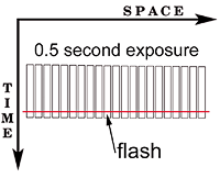 This example of open flash is a long exposure with a single flash at the end of the exposure. The flash was produced with a Nikon Speedlight (a small still camera flash) and was triggered by hand just before the Timetrack™ camera system's shutters closed.